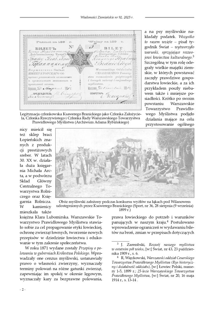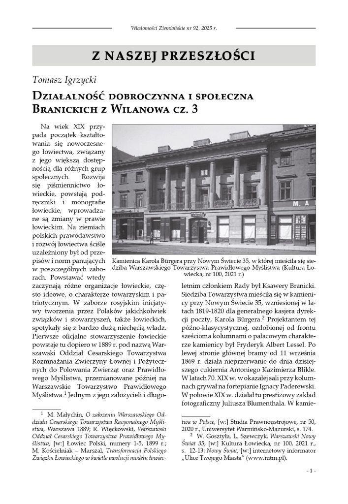 Na wiek XIX przypada początek kształtowania się nowoczesnego łowiectwa, związany z jego większą dostępnością dla różnych grup społecznych. Rozwija się piśmiennictwo łowieckie, powstają podręczniki i monografie łowieckie, wprowadzane są zmiany w prawie łowieckim. Na ziemiach polskich prawodawstwo i rozwój łowiectwa ściśle uzależniony był od przepisów i norm panujących w poszczególnych zaborach. Powstawać wtedy zaczynają różne organizacje łowieckie, często ideowe, o charakterze towarzyskim i patriotycznym. W zaborze rosyjskim inicjatywy tworzenia przez Polaków jakichkolwiek związków i stowarzyszeń, także łowieckich, spotykały się z bardzo dużą niechęcią władz. Pierwsze oficjalne stowarzyszenie łowieckie powstaje tu dopiero w 1889 r. pod nazwą Warszawski Oddział Cesarskiego Towarzystwa Rozmnażania Zwierzyny Łownej i Pożytecznych do Polowania Zwierząt oraz Prawidłowego Myślistwa, przemianowane później na Warszawskie Towarzystwo Prawidłowego Myślistwa. Jednym z jego założycieli i długoletnim członkiem Rady był Ksawery Branicki. Siedziba Towarzystwa mieściła się w kamienicy przy Nowym Świecie 35, wzniesionej w latach 1819 – 1820 dla generalnego kasjera dyrekcji poczty, Karola Bürgera. Projektantem tej późno – klasycystycznej ozdobionej od frontu sześcioma kolumnami o pałacowym charakterze kamienicy był Fryderyk Albert Lessel. Po lewej stronie głównej bramy od 11 września 1869 r. działa nieprzerwanie do dnia dzisiejszego cukiernia Antoniego Kazimierza Blikle. W latach 70. XIX w. w okazałej sali przy kolumnach grywał na fortepianie Ignacy Paderewski. W połowie XIX w. działał tu prestiżowy zakład fotograficzny Juliusza Blumenthala. W kamienicy mieścił się też sklep braci Łopieńskich znanych z produkcji prestiżowych sreber. W latach 30. XX w. działała duża księgarnia Michała Arcta, a w podwórzu Skład Główny Centralnego Towarzystwa Rolniczego oraz Księgarnia Rolnicza. W kamienicy mieszkała także księżna Klara Lubomirska. Warszawskie Towarzystwo Prawidłowego Myślistwa stawiało sobie za cel propagowanie etyki łowieckiej, ochronę zwierząt łownych, tworzenie nowych przepisów w dziedzinie łowiectwa i edukowanie w tym zakresie społeczeństwa.