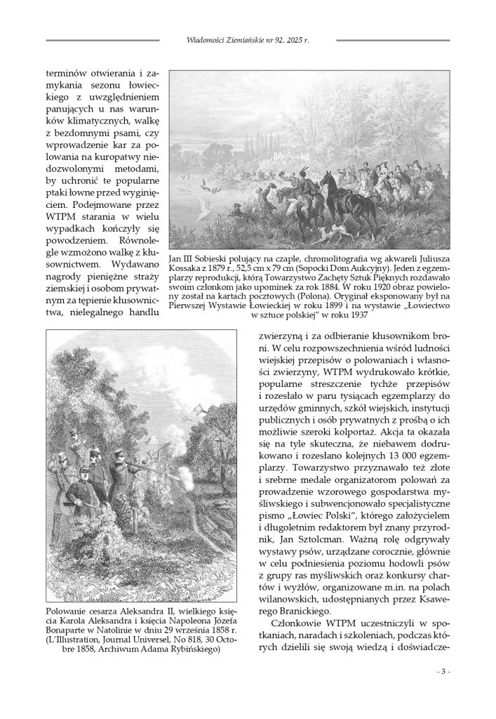 Równolegle wzmożono walkę z kłusownictwem. Wydawano nagrody pieniężne straży ziemskiej i osobom prywatnym za tępienie kłusownictwa, nielegalnego handlu zwierzyną i za odbieranie kłusownikom broni. W celu rozpowszechnienia wśród ludności wiejskiej przepisów o polowaniach i własności zwierzyny, WTPM wydrukowało krótkie, popularne streszczenie tychże przepisów i rozesłało w paru tysiącach egzemplarzy do urzędów gminnych, szkół wiejskich, instytucji publicznych i osób prywatnych z prośbą o ich możliwie szeroki kolportaż. Akcja ta okazała się na tyle skuteczna, że niebawem dodrukowano i rozesłano kolejnych 13 000 egzemplarzy. Towarzystwo przyznawało też złote i srebrne medale organizatorom polowań za prowadzenie wzorowego gospodarstwa myśliwskiego i subwencjonowało specjalistyczne pismo „Łowiec Polski”, którego założycielem i długoletnim redaktorem był znany przyrodnik, Jan Sztolcman. Ważną rolę odgrywały wystawy psów, urządzane corocznie, głównie w celu podniesienia poziomu hodowli psów z grupy ras myśliwskich oraz konkursy chartów i wyżłów, organizowane m. in. na polach wilanowskich, udostępnianych przez Ksawerego Branickiego.