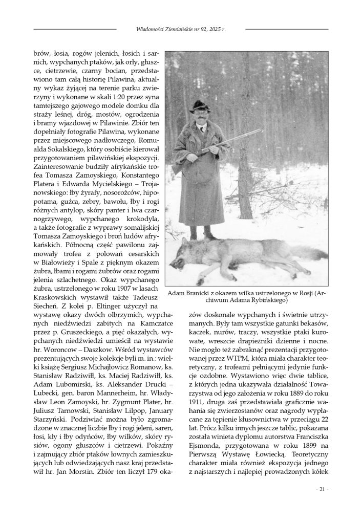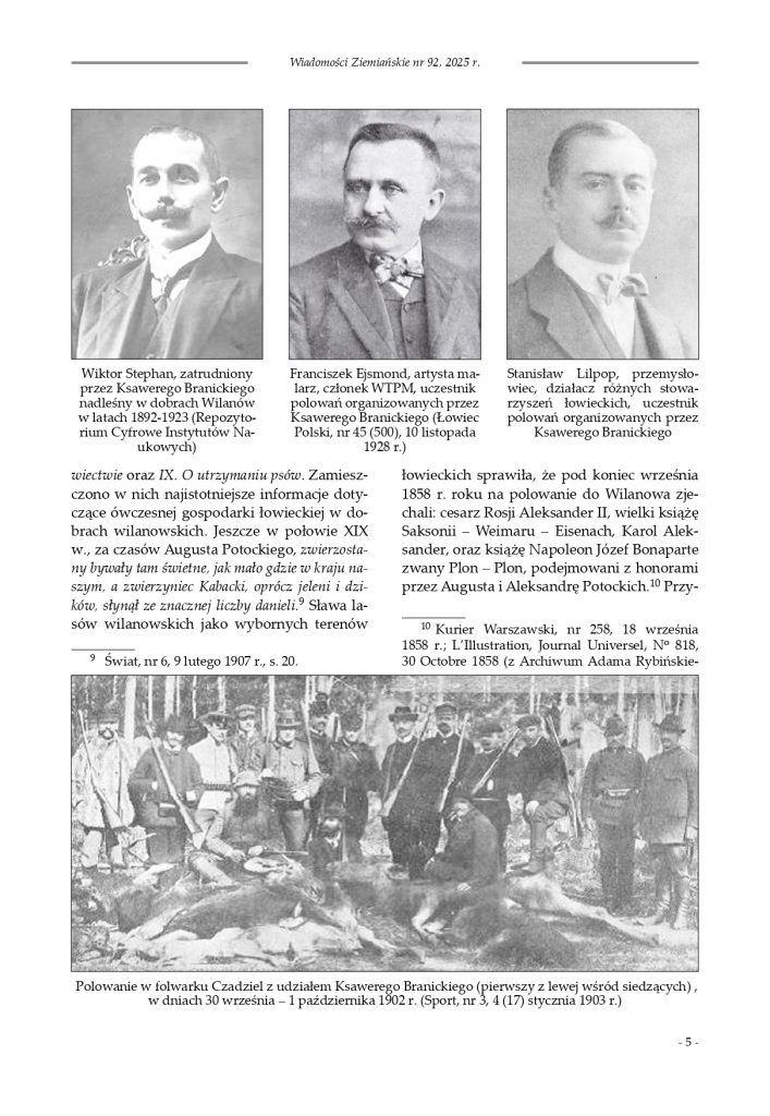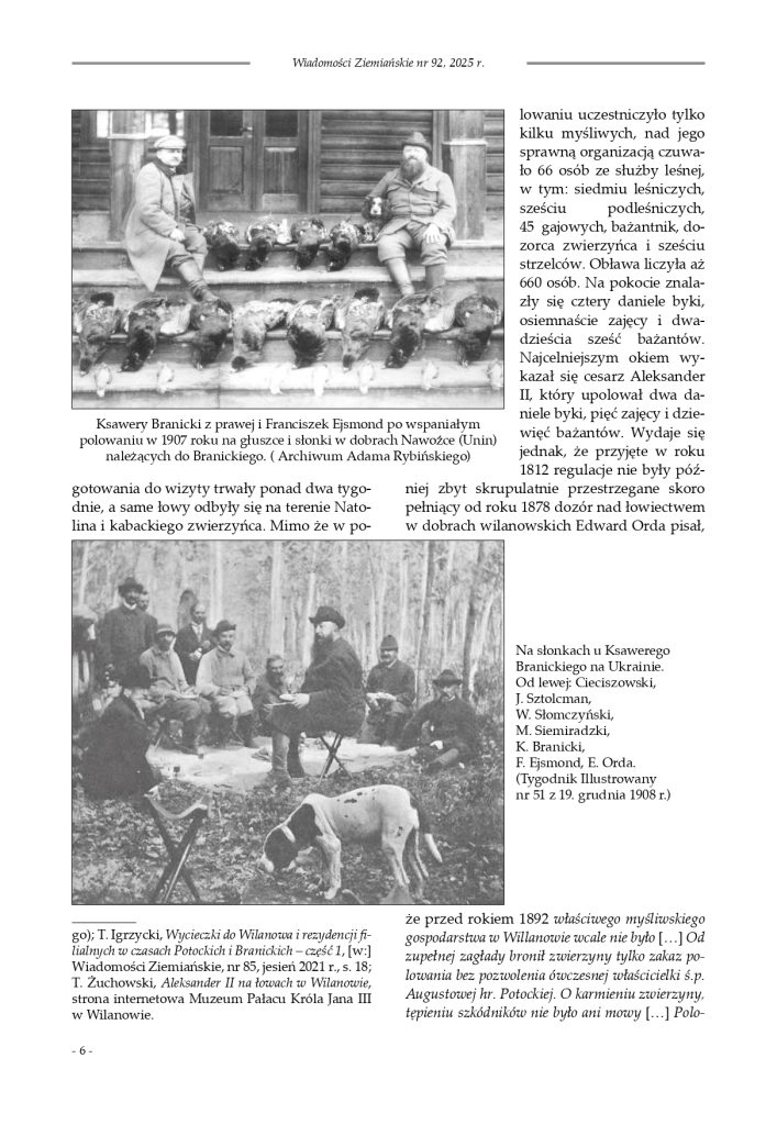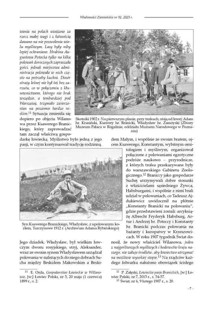 Na pokocie znalazły się cztery daniele byki, osiemnaście zajęcy i dwadzieścia sześć bażantów. Najcelniejszym okiem wykazał się cesarz Aleksander II, który upolował dwa daniele byki, pięć zajęcy i dziewięć bażantów. Wydaje się jednak, że przyjęte w roku 1812 regulacje nie były później zbyt skrupulatnie przestrzegane skoro pełniący od roku 1878 dozór nad łowiectwem w dobrach wilanowskich Edward Orda pisał, że przed rokiem 1892 właściwego myśliwskiego gospodarstwa w Willanowie wcale nie było […] Od zupełnej zagłady bronił zwierzyny tylko zakaz polowania bez pozwolenia ówczesnej właścicielki ś. p. Augustowej hr. Potockiej. O karmieniu zwierzyny, tępieniu szkódników nie było ani mowy […] Polowania na polach uważano za rzecz małej wagi i z łatwością dawano na nie pozwolenia wielu myśliwym. Lasy były niby lepiej ochraniane. Hrabina Augustowa Potocka tylko na kilka polowań dorocznych zapraszała gości, jednak miejscowa administracja polowała w nich często na potrzeby kuchni. Dozór straży leśnej nie był też bez zarzutu, co w połączeniu z kłusownictwem, którego nie brak wszędzie, a tembardziej pod Warszawą, trzymało zwierzostan na poziomie bardzo niskim. Sytuacja zmieniła się dopiero po objęciu Wilanowa przez Ksawerego Branickiego, który zaprowadzać tam zaczął właściwą gospodarkę łowiecką. Myślistwo było jedną z jego pasji, w czym kontynuował tradycję rodzinną. Jego dziadek, Władysław, był wielkim łowczym dworu rosyjskiego, stryj, Aleksander, wraz ze swoim synem Władysławem urządzał polowania w należących do niego dobrach Sucha między Beskidem Makowskim a Beskidem Małym, i wspólnie ze swoim bratem, ojcem Ksawerego, Konstantym, wybitnym ornitologiem i myśliwym, organizował połączone z polowaniami egzotyczne podróże naukowo – przyrodnicze, z których trofea przekazywane były do warszawskiego Gabinetu Zoologicznego. Braniccy jako gospodarze Suchej utrzymywali dobre stosunki z właścicielami sąsiedniego Żywca, Habsburgami, i wspólnie z nimi brali udział w polowaniach, co Tadeusz Ajdukiewicz uwidocznił na płótnie „Konstanty Branicki na polowaniu”, gdzie przedstawieni zostali: arcyksiążę Albrecht Fryderyk Habsburg, Artur i Andrzej hr. Potoccy i Konstanty hr. Branicki podczas polowania na bażanty i kuropatwy w Krzeszowicach.