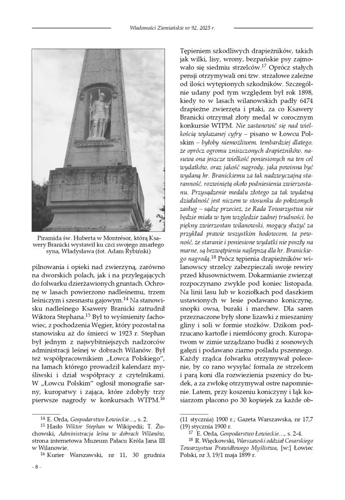 W roku 1907 tygodnik Świat donosił, że nowy właściciel Wilanowa, jeden z najgorliwszych myśliwych i hodowców kraju naszego, nie żałuje środków, aby łowiectwo utrzymać na możliwie wysokiej stopie. Na rządców każdego folwarku nałożono obowiązek ścisłego pilnowania i opieki nad zwierzyną, zarówno na dworskich polach, jak i na przylegających do folwarku dzierżawionych gruntach. Ochronę w lasach powierzono nadleśnemu, trzem leśniczym i szesnastu gajowym. Na stanowisku nadleśnego Ksawery Branicki zatrudnił Wiktora Stephana. Był to wyśmienity fachowiec, z pochodzenia Węgier, który pozostał na stanowisku aż do śmierci w 1923 r. Stephan był jednym z najwybitniejszych nadzorców administracji leśnej w dobrach Wilanów. Był też współpracownikiem „Łowca Polskiego”, na łamach którego prowadził kalendarz myśliwski i dział współpracy z czytelnikami. W „Łowcu Polskim” ogłosił monografie sarnykuropatwy i zająca, które zdobyły trzy pierwsze nagrody w konkursach WTPM. Tępieniem szkodliwych drapieżników, takich jak wilki, lisy, wrony, bezpańskie psy zajmowało się siedmiu strzelców. Oprócz stałych pensji otrzymywali oni tzw. strzałowe zależne od ilości wytępionych szkodników. Szczególnie udany pod tym względem był rok 1898, kiedy to w lasach wilanowskich padły 6474 drapieżne zwierzęta i ptaki, za co Ksawery Branicki otrzymał złoty medal w corocznym konkursie WTPM. Nie zastanowić się nad wielkością wykazanej cyfry – pisano w Łowcu Polskim – byłoby niemożliwem, tembardziej dlatego, że oprócz ogromu zniszczonych drapieżników, nasuwa ona jeszcze wielkość poniesionych na ten cel wydatków, oraz jakość nagrody, jaka powinna być wydaną hr. Branickiemu za tak nadzwyczajną staranność, rozwiniętą około podniesienia zwierzostanu. Przysądzenie medalu złotego za tak wydatną działalność jest niczem w stosunku do położonych zasług – sądzę przecież, że Rada Towarzystwa nie będzie miała w tym względzie żadnej trudności, bo piękny zwierzostan wilanowski, mogący służyć za przykład prawie wszystkim hodowcom, ta pewność, że staranie i poniesione wydatki nie poszły na marne, są bezwątpienia najlepszą dla hr. Branickiego nagrodą. Prócz tępienia drapieżników wilanowscy strzelcy zabezpieczali swoje rewiry przed kłusownictwem. Dokarmianie zwierząt rozpoczynano zwykle pod koniec listopada. Na linii lasu lub w koziołkach pod daszkiem ustawionych w lesie podawano koniczynę, snopki owsa, buraki i marchew. Dla saren przeznaczone były słone lizawki z mieszaniny gliny i soli w formie stożków. Dzikom podrzucano kartofle i niemłócony groch. Kuropatwom w zimie urządzano budki z sosnowych gałęzi i podawano ziarno pośladu pszennego. Każdy rządca folwarku otrzymywał polecenie, by co rano wysyłać fornala ze strzelcem i parą koni dla rozwiezienia pszenicy do budek, a za zwłokę otrzymywał ostre napomnienie. Latem, przy koszeniu koniczyny i łąk kosiarzom płacono po 30 kopiejek za każde obkoszone i niezepsute kosą gniazdo kuropatw.