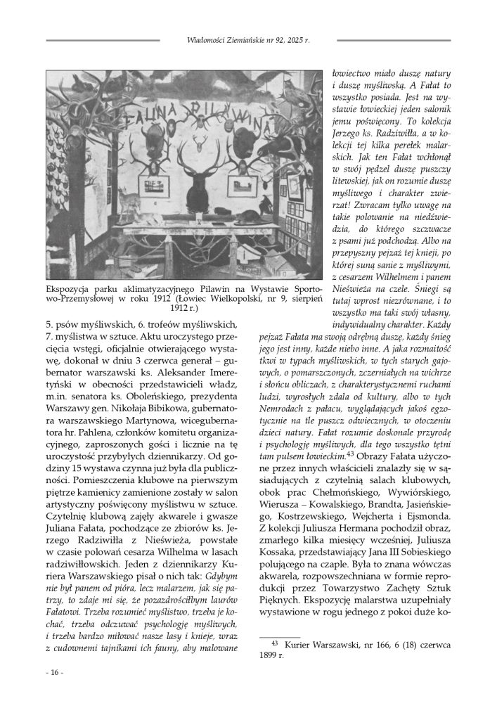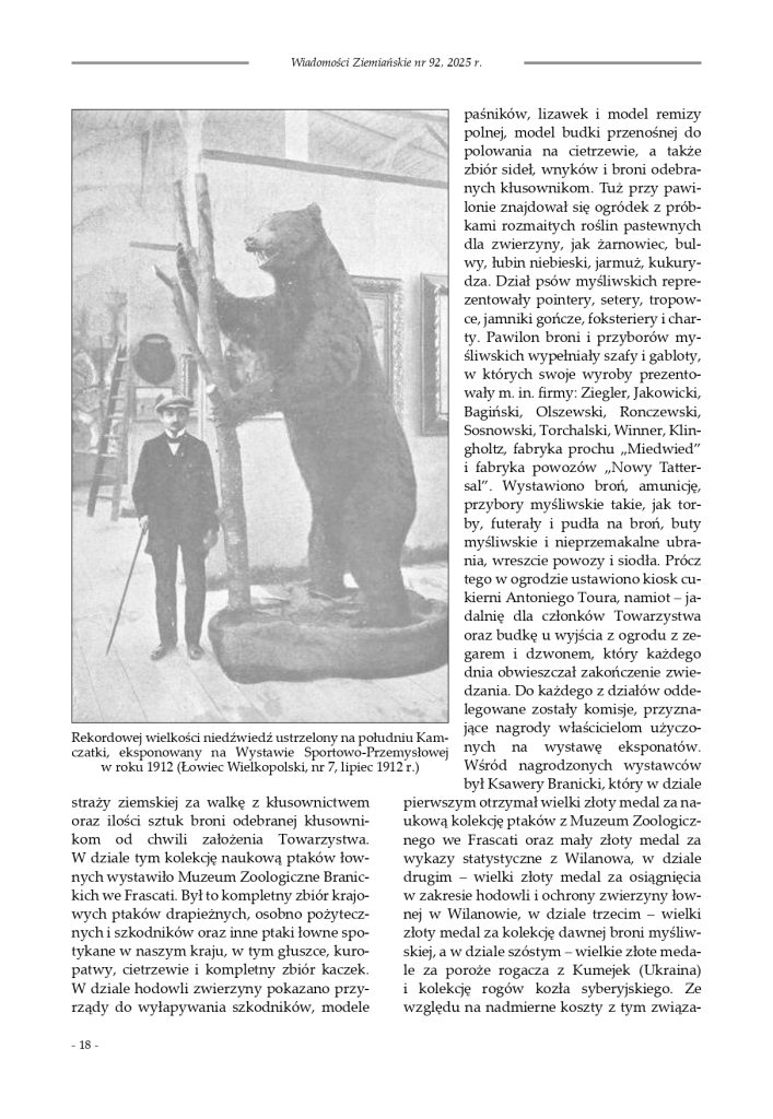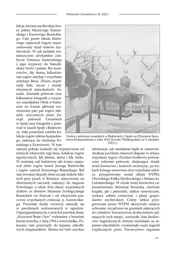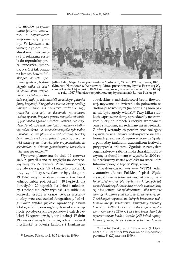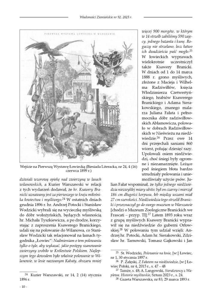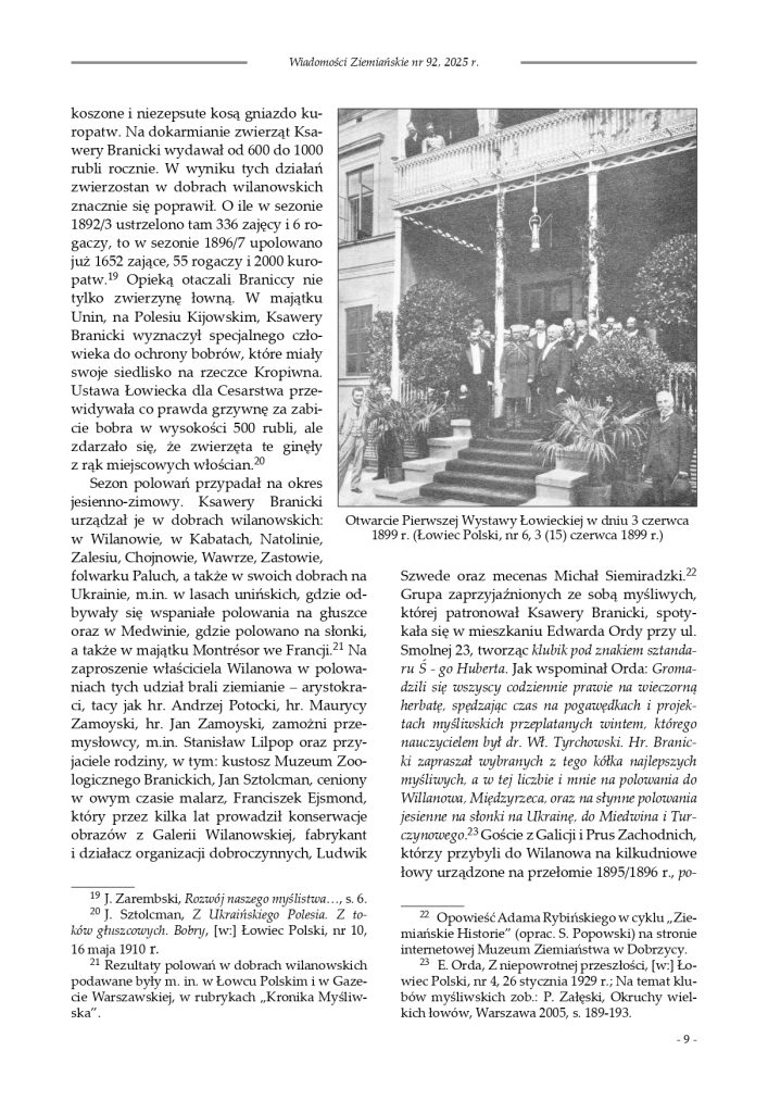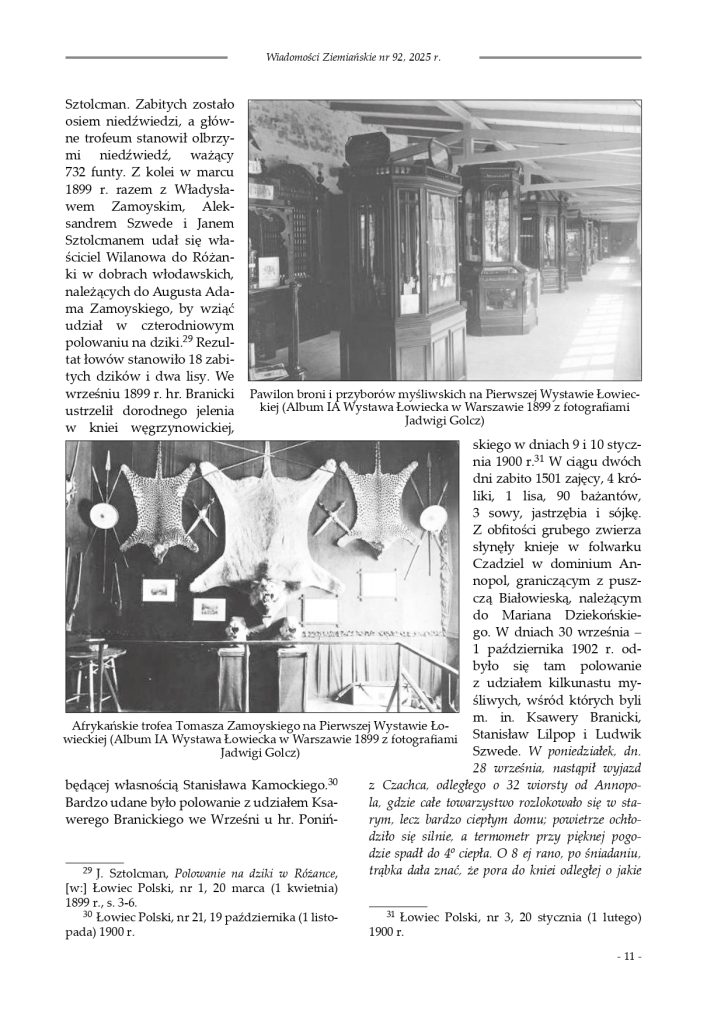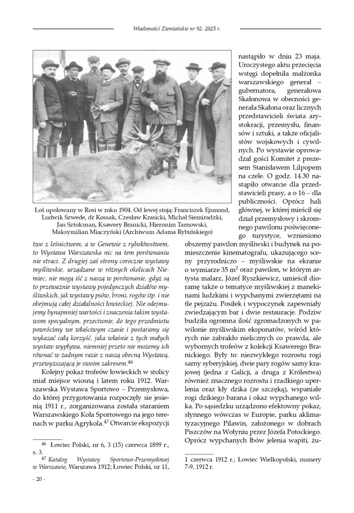 W czerwcu 1899 r. wydarzeniem obszernie relacjonowanym i komentowanym na łamach prasy była w stolicy wystawa łowiecka, o której tak pisał dziennikarz Gazety Warszawskiej: Doczekała się wreszcie Warszawa pierwszej Wystawy Łowieckiej, otwartej z inicyatywy Warszawskiego Oddziału Cesarskiego Towarzystwa prawidłowego myślistwa. Małe zaludnienie kraju, wielkie przestrzenie lasów sprzyjały mnożeniu się zwierzyny, a myśliwy wytężał tylko umysł na wynalezienie sposobów najłatwiejszego jej złowienia. Z czasem stosunki się zmieniły tak dalece, że trzeba było pomyśleć o środkach ochronienia zwierzyny od zupełnego wytępienia. Prawo o polowaniu i założenie Towarzystwa racyonalnego myślistwa, to pierwsze kroki na drodze zreformowania łowiectwa i zastosowania go do nowych potrzeb społeczeństwa. Wystawa to dalszy krok na tej drodze i to nader ważny, bo od czasu wielkiej wystawy powszechnej w pałacu kryształowym w Londynie uznano wystawy jako najpewniejszy środek porozumienia się ludzi na jednem polu pracujących, jako najsilniejszą dźwignię postępu. Myśliwy teraźniejszy hoduje zwierzynę, a łowiąc ją dokłada starań, aby to uczynić, jaknajmniej ją niepokojąc, ochrania i tępi jej wrogów. Wystawa przedstawia to wszystko naocznie, co zdziałali na tem polu ludzie inicyatywy, zachęca ludzi dobrej woli, ludzi śpiących, poucza nieumiejętnych. Zważając, że to pierwsza próba w tym kierunku, śmiało twierdzić możemy, że udała się wyśmienicie, a co więcej, że stanowi wierny obraz łowiectwa w kraju: w większych majątkach postęp widoczny, średnie dążą za niemi w wolnym tempie, mała zaś własność, o ile może korzysta z cudzej pracy i zabiegliwości, o czem wymownie świadczą wystawione liczne okazy zabranej kłusownikom broni. Urządzenie, ustawienie i cała zewnętrzna dekoracya są świetne i szczera należy się komitetowi zarządzającemu wdzięczność za tyle pracy w tym celu podjętej.
