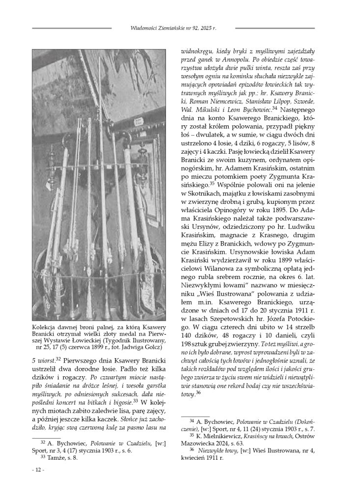 Pierwszego dnia Ksawery Branicki ustrzelił dwa dorodne łosie. Padło też kilka dzików i rogaczy. Po czwartym miocie nastąpiło śniadanie na dróżce leśnej, i wesoła garstka myśliwych, po odniesionych sukcesach, dała niepośledni koncert na bitkach i bigosie. W kolejnych miotach zabito zaledwie lisa, parę zajęcy, a później jeszcze kilka kaczek. Słońce już zachodziło, kryjąc swą czerwoną kulę za pasmo lasu na widnokręgu, kiedy bryki z myśliwymi zajeżdżały przed ganek w Annopolu. Po obiedzie część towarzystwa ułożyła dwie pulki winta, reszta zaś przy wesołym ogniu na kominku słuchała niezwykle zajmujących opowiadań epizodów łowieckich tak wytrawnych myśliwych jak pp.: hr. Ksawery Branicki, Roman Niemcewicz, Stanisław Lilpop, Szwede, Wal. Mikulski i Leon Bychowiec. Następnego dnia na konto Ksawerego Branickiego, który został królem polowania, przypadł piękny łoś – dwulatek, a w sumie, w ciągu dwóch dni ustrzelono 4 łosie, 4 dziki, 6 rogaczy, 5 lisów, 8 zajęcy i 4 kaczki. Więzy koleżeńskie i pasja łowiecka łączyły Ksawerego Branickiego z ordynatem opinogórskim, hr. Adamem Krasińskim, ostatnim po mieczu potomkiem poety Zygmunta Krasińskiego. Wspólnie polowali oni na jelenie w Skotnikach, majątku z łowiskami zasobnymi w zwierzynę drobną i grubą, kupionym przez właściciela Opinogóry w roku 1895. Do Adama Krasińskiego należał także podwarszawski Ursynów, odziedziczony po hr. Ludwiku Krasińskim, magnacie z Krasnego, drugim mężu Elizy z Branickich, wdowy po Zygmuncie Krasińskim. Ursynowskie łowiska Adam Krasiński wydzierżawił w roku 1899 właścicielowi Wilanowa za symboliczną opłatą jednego rubla srebrem rocznie, na okres 6. lat. Niezwykłymi łowami” nazwano w miesięczniku „Wieś Ilustrowana” polowania z udziałem m. in. Ksawerego Branickiego, urządzone w dniach od 17 do 20 stycznia 1911 r. w lasach Szepetowskich hr. Józefa Potockiego. W ciągu czterech dni ubito w 14 strzelb 140 dzików, 48 rogaczy i 10 danieli, czyli 198 sztuk grubej zwierzyny. To też myśliwi, a grono ich było dobrane, wprost wprowadzeni byli w zachwyt całością tych łowów i jednogłośnie uznali, że takich rozkładów pod względem ilości i jakości grubego zwierza w życiu swem nie widzieli i niewątpliwie stanowią one rekord bodaj czy nie wszechświatowy.