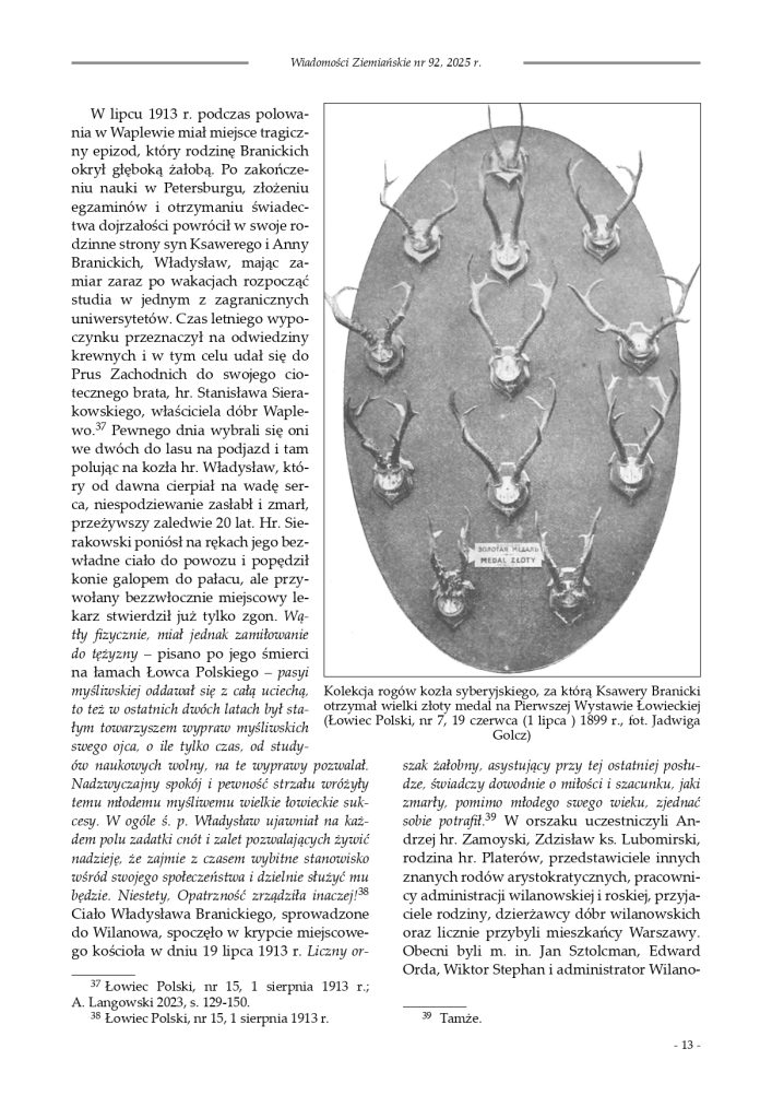 W lipcu 1913 r. podczas polowania w Waplewie miał miejsce tragiczny epizod, który rodzinę Branickich okrył głęboką żałobą. Po zakończeniu nauki w Petersburgu, złożeniu egzaminów i otrzymaniu świadectwa dojrzałości powrócił w swoje rodzinne strony syn Ksawerego i Anny Branickich, Władysław, mając zamiar zaraz po wakacjach rozpocząć studia w jednym z zagranicznych uniwersytetów. Czas letniego wypoczynku przeznaczył na odwiedziny krewnych i w tym celu udał się do Prus Zachodnich do swojego ciotecznego brata, hr. Stanisława Sierakowskiego, właściciela dóbr Waplewo. Pewnego dnia wybrali się oni we dwóch do lasu na podjazd i tam polując na kozła hr. Władysław, który od dawna cierpiał na wadę serca, niespodziewanie zasłabł i zmarł, przeżywszy zaledwie 20 lat. Hr. Sierakowski poniósł na rękach jego bezwładne ciało do powozu i popędził konie galopem do pałacu, ale przywołany bezzwłocznie miejscowy lekarz stwierdził już tylko zgon. Wątły fizycznie, miał jednak zamiłowanie do tężyzny – pisano po jego śmierci na łamach Łowca Polskiego – pasyi myśliwskiej oddawał się z całą uciechą, to też w ostatnich dwóch latach był stałym towarzyszem wypraw myśliwskich swego ojca, o ile tylko czas, od studyów naukowych wolny, na te wyprawy pozwalał. Nadzwyczajny spokój i pewność strzału wróżyły temu młodemu myśliwemu wielkie łowieckie sukcesy. W ogóle ś. p. Władysław ujawniał na każdem polu zadatki cnót i zalet pozwalających żywić nadzieję, że zajmie z czasem wybitne stanowisko wśród swojego społeczeństwa i dzielnie służyć mu będzie. Niestety, Opatrzność zrządziła inaczej ! Ciało Władysława Branickiego, sprowadzone do Wilanowa, spoczęło w krypcie miejscowego kościoła w dniu 19 lipca 1913 r. Liczny orszak żałobny, asystujący przy tej ostatniej posłudze, świadczy dowodnie o miłości i szacunku, jaki zmarły, pomimo młodego swego wieku, zjednać sobie potrafił. W orszaku uczestniczyli Andrzej hr. Zamoyski, Zdzisław ks. Lubomirski, rodzina hr. Platerów, przedstawiciele innych znanych rodów arystokratycznych, pracownicy administracji wilanowskiej i roskiej, przyjaciele rodziny, dzierżawcy dóbr wilanowskich oraz licznie przybyli mieszkańcy Warszawy. Obecni byli m. in. Jan Sztolcman, Edward Orda, Wiktor Stephan i administrator Wilanowa, Stanisław Żaboklicki. Część żałobników, chcąc uczcić pamięć zmarłego, zdecydowała się wpłacić pewne kwoty na cele charytatywne. Większość datków przeznaczono na Warszawski Szpital dla Dzieci przy ul. Kopernika, w którego zarządzie zasiadali i którego działalność wspierali finansowo Ksawery i Anna Braniccy, oraz na wpisy dla niezamożnych uczniów i uczennic szkół prywatnych. Ku czci swojego syna Ksawery Branicki wystawił w lesie montrésorskim obelisk zwany Piramidą św. Huberta. W Waplewie upamiętnia go kamienny krzyż.