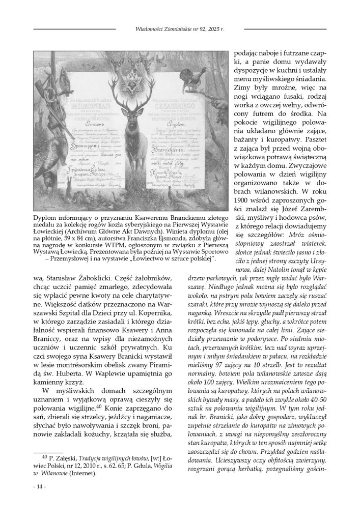 W myśliwskich domach szczególnym uznaniem i wyjątkową oprawą cieszyły się polowania wigilijne. Konie zaprzęgano do sań, zbierali się strzelcy, jeźdźcy i naganiacze, słychać było nawoływania i szczęk broni, panowie zakładali kożuchy, krzątała się służba, podając naboje i futrzane czapki, a panie domu wydawały dyspozycje w kuchni i ustalały menu myśliwskiego śniadania. Zimy były mroźne, więc na nogi wciągano fusaki, rodzaj worka z owczej wełny, odwrócony futrem do środka. Na pokocie wigilijnego polowania układano głównie zające, bażanty i kuropatwy. Pasztet z zająca był przed wojną obowiązkową potrawą świąteczną w każdym domu. Zwyczajowe polowania w dzień wigilijny organizowano także w dobrach wilanowskich. W roku 1900 wśród zaproszonych gości znalazł się Józef Zarembski, myśliwy i hodowca psów, z którego relacji dowiadujemy się szczegółów: Mróz ośmiostopniowy zaostrzał wiaterek, słońce jednak świeciło jasno i złociło z jednej strony szczyty Ursynowa, dalej Natolin tonął w kępie drzew parkowych, jak przez mgłę widać było Warszawę. Niedługo jednak można się było rozglądać wokoło, na pstrym polu bowiem zaczęły się ruszać szaraki, które przy mrozie wynoszą się daleko przed naganką. Wreszcie na skrzydle padł pierwszy strzał krótki, bez echa, jakiś tępy, głuchy, a wkrótce potem rozpoczęła się kanonada na całej linii. Zające siedziały przeważnie w podorywce. Po siedmiu miotach, przerwanych krótkim, lecz nad wyraz uprzejmym i miłym śniadankiem w pałacu, na rozkładzie mieliśmy 97 zajęcy na 10 strzelb. Jest to rezultat normalny, bowiem pola wilanowskie zawsze dają około 100 zajęcy. Wielkim urozmaiceniem tego polowania są kuropatwy, których na polach wilanowskich bywały masy, a padało ich zwykle około 40 – 50 sztuk na polowaniu wigilijnym. W tym roku jednak hr. Branicki, jako dobry gospodarz, wykluczył zupełnie strzelanie do kuropatw na zimowych polowaniach, z uwagi na niepomyślny zeszłoroczny stan kuropatw, których w ten sposób najmniej setkę zaoszczędzi się do chowu. Przykład godzien naśladowania. Ucieszywszy oczy obfitością zwierzyny, rozgrzani gorącą herbatką, pożegnaliśmy gościnne wilanowskie progi i o godzinie czwartej po południu byliśmy z powrotem w Warszawie. Gdy zajaśniała gwiazdka na niebie, każdy zasiadł do wigilijnej uczty z prawdziwym zadowoleniem w duszy, a łamiąc opłatek z najbliższymi sercu, myślą biegł również i na te pola z życzeniem, oby i tam jak najlepiej się działo…