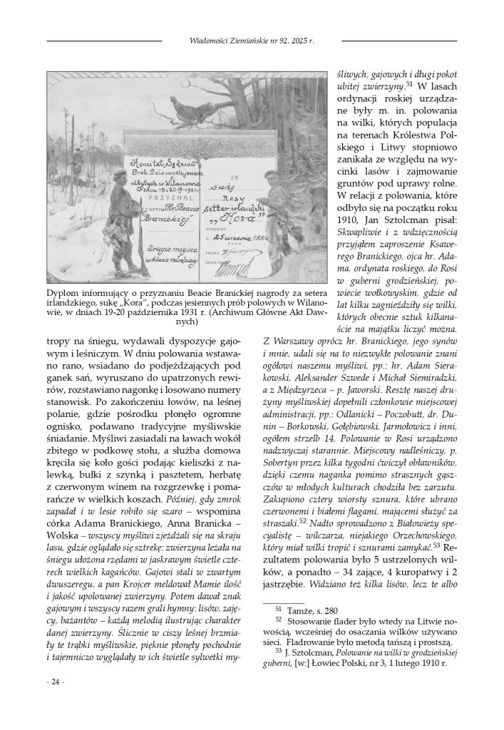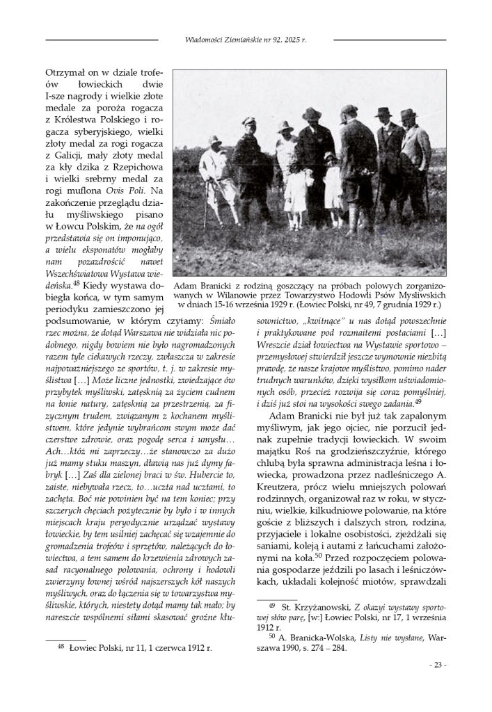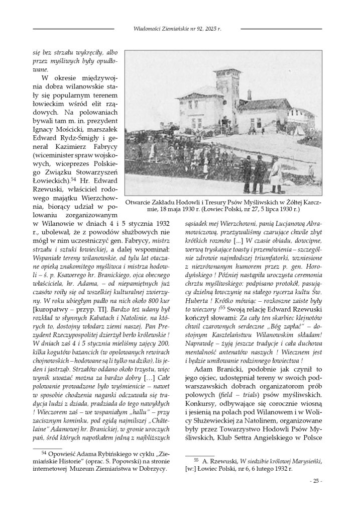W okresie międzywojnia dobra wilanowskie stały się popularnym terenem łowieckim wśród elit rządowych. Na polowaniach bywali tam m. in. prezydent Ignacy Mościcki, marszałek Edward Rydz – Śmigły i generał Kazimierz Fabrycy (wiceminister spraw wojskowych, wiceprezes Polskiego Związku Stowarzyszeń Łowieckich). Hr. Edward Rzewuski, właściciel rodowego majątku Wierzchownia, biorący udział w polowaniu zorganizowanym w Wilanowie w dniach 4 i 5 stycznia 1932 r., ubolewał, że z powodów służbowych nie mógł w nim uczestniczyć gen. Fabrycy, mistrz strzału i sztuki łowieckiej, a dalej wspominał: Wspaniałe tereny wilanowskie, od tylu lat otaczane opieką znakomitego myśliwca i mistrza hodowli – ś. p. Ksawerego hr. Branickiego, ojca obecnego właściciela, hr. Adama, – od niepamiętnych już czasów roiły się od wszelkiej kulturalnej zwierzyny. W roku ubiegłym padło na nich około 800 kur [kuropatwy – przyp. TI]. Bardzo też udany był rozkład w słynnych Kabatach i Natolinie, na których to, dostojny włodarz ziemi naszej, Pan Prezydent Rzeczypospolitej dzierżył berło królewskie ! W dniach zaś 4 i 5 stycznia mieliśmy zajęcy 200, kilka kogutów bażancich (w opolowanych rewirach chojnowskich – hodowane są li tylko na dziko), lis jeden i jastrząb. Strzałów oddano około trzystu, więc wynik uważać można za bardzo dobry […] Całe polowanie prowadzone było wyśmienicie – nawet w sposobie chodzenia naganki odczuwała się tradycja ludzi z dziada, pradziada do tego nawykłych ! Wieczorem zaś – we wspaniałym „hallu” – przy zacisznym kominku, pod egidą najmilszej „Châtelaine” Adamowej hr. Branickiej, w gronie uroczych pań, śród których napotkałem jedną z najbliższych sąsiadek mej Wierzchowni, panią Lucjanową Abramowiczową, przeżywaliśmy czarujące chwile zbyt krótkich rozmów […] W czasie obiadu, dowcipne, werwą tryskające toasty i przemówienia – szczególnie zdrowie najmłodszej triumfatorki, wzniesione z niezrównanym humorem przez p. gen. Horodyńskiego ! Później nastąpiła uroczysta ceremonia chrztu myśliwskiego: podpisano protokół, pasujący dzielną łowczynię na stałego rycerza kultu Św. Huberta ! Krótko mówiąc – rozkoszne zaiste były to wieczory ! Swoją relację Edward Rzewuski kończył słowami: Za cały ten skarbiec klejnotów chwil czarownych serdeczne „Bóg zapłać” – dostojnym Kasztelaństwu Wilanowskim składam ! Naprawdę – żyją jeszcze tradycje i cała duchowa mentalność antenatów naszych ! Wiecznem jest i będzie umiłowanie rodzinnego łowiectwa !