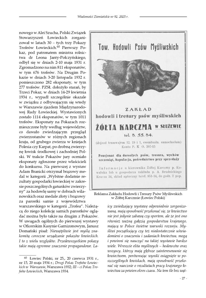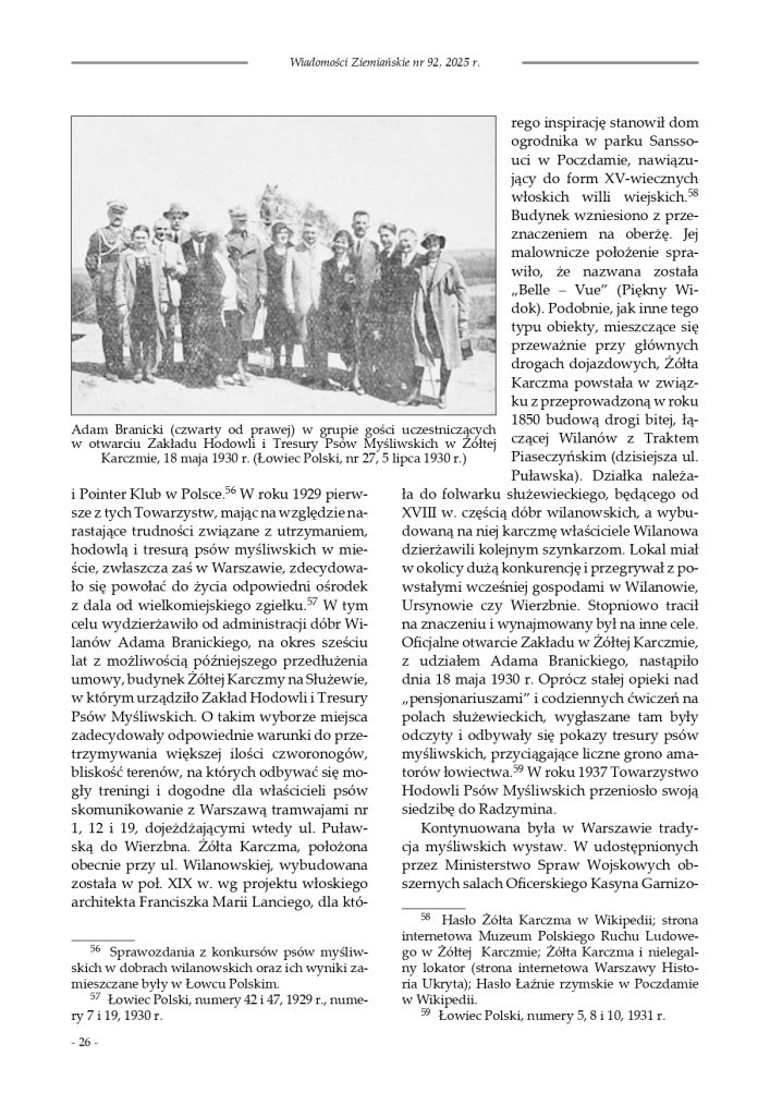 Adam Branicki, podobnie jak czynił to jego ojciec, udostępniał tereny w swoich podwarszawskich dobrach organizatorom prób polowych (field – trials) psów myśliwskich. Konkursy, odbywające się corocznie wiosną i jesienią na polach pod Wilanowem i w Wolicy Służewieckiej za Natolinem, organizowane były przez Towarzystwo Hodowli Psów Myśliwskich, Klub Settra Angielskiego w Polsce i Pointer Klub w Polsce. W roku 1929 pierwsze z tych Towarzystw, mając na względzie narastające trudności związane z utrzymaniem, hodowlą i tresurą psów myśliwskich w mieście, zwłaszcza zaś w Warszawie, zdecydowało się powołać do życia odpowiedni ośrodek z dala od wielkomiejskiego zgiełku. W tym celu wydzierżawiło od administracji dóbr Wilanów Adama Branickiego, na okres sześciu lat z możliwością późniejszego przedłużenia umowy, budynek Żółtej Karczmy na Służewie, w którym urządziło Zakład Hodowli i Tresury Psów Myśliwskich. O takim wyborze miejsca zadecydowały odpowiednie warunki do przetrzymywania większej ilości czworonogów, bliskość terenów, na których odbywać się mogły treningi i dogodne dla właścicieli psów skomunikowanie z Warszawą tramwajami nr 1, 12 i 19, dojeżdżającymi wtedy ul. Puławską do Wierzbna. Żółta Karczma, położona obecnie przy ul. Wilanowskiej, wybudowana została w poł. XIX w. wg projektu włoskiego architekta Franciszka Marii Lanciego, dla którego inspirację stanowił dom ogrodnika w parku Sanssouci w Poczdamie, nawiązujący do form XV – wiecznych włoskich willi wiejskich. Budynek wzniesiono z przeznaczeniem na oberżę. Jej malownicze położenie sprawiło, że nazwana została „Belle – Vue” (Piękny Widok). Podobnie, jak inne tego typu obiekty, mieszczące się przeważnie przy głównych drogach dojazdowych, Żółta Karczma powstała w związku z przeprowadzoną w roku 1850 budową drogi bitej, łączącej Wilanów z Traktem Piaseczyńskim (dzisiejsza ul Puławska). Działka należała do folwarku służewieckiego, będącego od XVIII w. częścią dóbr wilanowskich, a wybudowaną na niej karczmę właściciele Wilanowa dzierżawili kolejnym szynkarzom. Lokal miał w okolicy dużą konkurencję i przegrywał z powstałymi wcześniej gospodami w Wilanowie, Ursynowie czy Wierzbnie. Stopniowo tracił na znaczeniu i wynajmowany był na inne cele. Oficjalne otwarcie Zakładu w Żółtej Karczmie, z udziałem Adama Branickiego, nastąpiło dnia 18 maja 1930 r. Oprócz stałej opieki nad „pensjonariuszami” i codziennych ćwiczeń na polach służewieckich, wygłaszane tam były odczyty i odbywały się pokazy tresury psów myśliwskich, przyciągające liczne grono amatorów łowiectwa. W roku 1937 Towarzystwo Hodowli Psów Myśliwskich przeniosło swoją siedzibę do Radzymina.