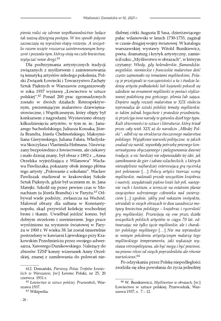 Dla podtrzymania artystycznych tradycji związanych z myślistwem i zainteresowania tą tematyką artystów młodego pokolenia, Polski Związek Łowiecki i Towarzystwo Zachęty Sztuk Pięknych w Warszawie zorganizowały w roku 1937 wystawę „Łowiectwo w sztuce polskiej”. Ponad 200 prac zgromadzonych zostało w dwóch działach: Retrospektywnym, prezentującym malarstwo dziewiętnastowieczne, i Współczesnym, który objęty był konkursem z nagrodami. Wystawiono obrazy kilkudziesięciu artystów, w tym m. in.: Januarego Suchodolskiego, Juliusza Kossaka, Józefa Brandta, Józefa Chełmońskiego, Maksymiliana Gierymskiego, Juliana Fałata, Władysława Skoczylasa i Vlastimila Hofmana. Niezwiązany bezpośrednio z łowiectwem, ale ciekawy i mało dzisiaj znany, był obraz z 1892 r. „Anna Orzelska wyjeżdżająca z Wilanowa” Wacława Pawliszaka, pokazany obok innego płótna tego artysty „Polowanie z sokołami”. Wacław Pawliszak studiował w krakowskiej Szkole Sztuk Pięknych, gdzie był uczniem m. in. Jana Matejki. Szkolił się przez pewien czas w Monachium (u Józefa Brandta) i w Paryżu. Odbywał wiele podróży, zwłaszcza na Wschód. Malował obrazy dla sułtana w Konstantynopolu, skąd przywiózł kolekcję wschodniej broni i tkanin. Uwielbiał jeździć konno, był dobrym strzelcem i szermierzem. Jego prace wyróżniono na wystawie światowej w Paryżu w 1900 r. W wieku 38. lat został śmiertelnie postrzelony w kawiarni Lijewskiego przy Krakowskim Przedmieściu przez swojego adwersarza, Xawerego Dunikowskiego. Należący do zbiorów TZSP konny wizerunek Anny Orzelskiej, znanej z zamiłowania do polowań nieślubnej córki Augusta II Sasa, dzierżawiącego pałac wilanowski w latach 1730 – 1733, zaginął w czasie drugiej wojny światowej. W katalogu warszawskiej wystawy Witold Bunikiewicz, poeta, dramaturg i krytyk artystyczny, zamieścił szkic „Myśliwstwo w obrazach”, w którym czytamy: Wtedy, gdy holenderskie, flamandzkie, angielskie, niemieckie i francuskie malarstwo dość często zajmowało się tematami myśliwskimi, Polacy je przeżywali w rzeczywistości a tu i ówdzie ludowy artysta podhalański lub kujawski pokusił się zaledwie na ornament myśliwski w postaci stylizowanej podobizny psa gończego, jelenia lub zająca. Dopiero nagły rozwój malarstwa w XIX stuleciu wprowadza do sztuki polskiej tematy myśliwskie, w takim jednak bogactwie i prawdzie przedmiotu, iż prześciga inne narody w gatunku dzieł tego typu. Kult zbiorowości w sztuce i literaturze, który trwał przez cały wiek XIX aż do narodzin „Młodej Polski”, odbił się na strukturze ówczesnego malarstwa polskiego. Wyjątkowe warunki polityczne, w jakich znalazł się naród, wywołały potrzebę pewnego konserwatyzmu obyczajowego i pielęgnowania dawnej tradycji, a nic bardziej nie odpowiadało tej idei, jak zamiłowanie do gier i zabaw szlacheckich, z których niewątpliwie najbardziej interesującą grą rycerską jest polowanie […] Polscy artyści tworząc sceny myśliwskie, malowali przede wszystkim krajobraz i nastrój, uwydatniali piękno kniei lub pól, następnie ruch i kostium, a wreszcie na ostatnim planie zwycięstwo uzbrojonego człowieka nad zwierzęciem […] zgodnie, jakby pod nakazem instynktu, utrwalali w swych obrazach te dwa zasadnicze motywy łowiectwa polskiego – krajobraz i rycerskość gry myśliwskiej. Przewijają się one przez dzieła wszystkich polskich artystów w ciągu 70 lat, odtwarzając nie tylko życie myśliwskie, ale i charakter polskiego myśliwego […] Nie ma wprawdzie w nowym pokoleniu artystycznym malarzy tego myśliwskiego temperamentu, jaki wykazuje wystawa retrospektywna, ale być mogą i być powinni, na pewno różni od swych poprzedników ale równie wartościowi.